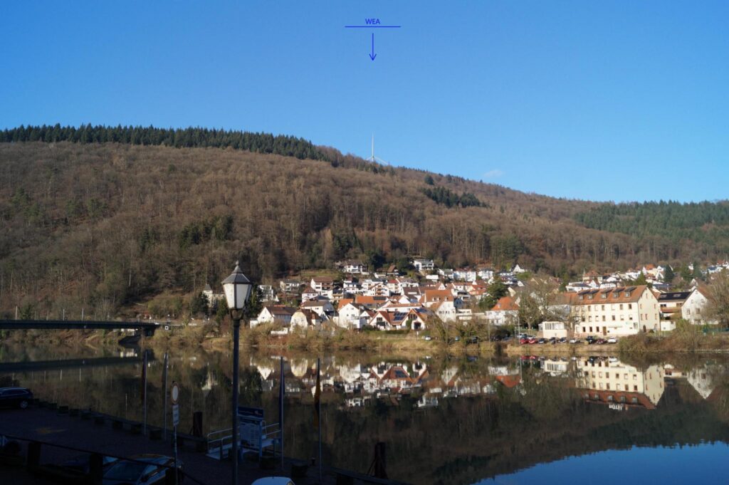 Hier ein Blick vom Neckarlauer auf der südlichen Neckarseite unter der Neckargemünder Altstadt. Zu sehen ist hier das geplante „Neckargemünder“ Windrad, so wie es sich vermutlich darstellen würde. Die möglichen Heidelberger Anlagen sind hier nicht mitmodelliert – von denen wäre ggfs ein kleiner Teil auch sichtbar.
